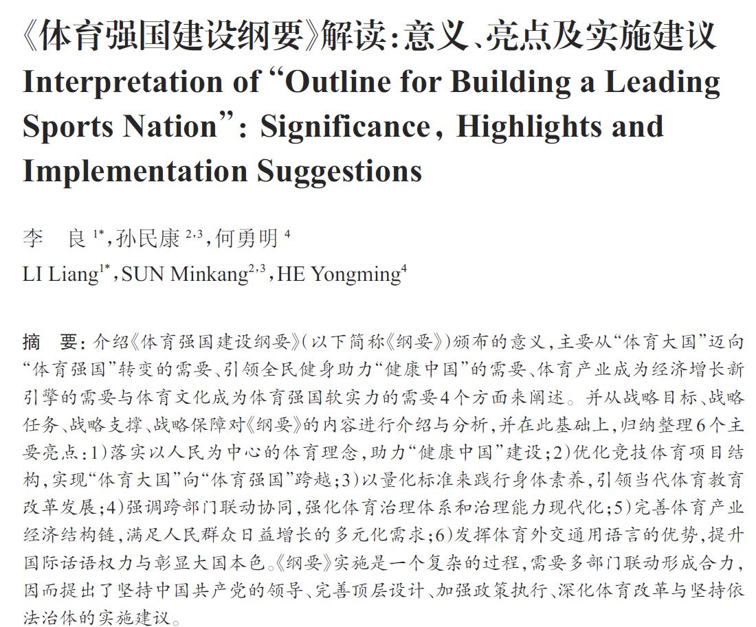 This paper first introduces the significance of the promulgation of“Outline for Buildinga Leading Sports Nation”(hereinafter referred to as the Outline), mainly from four aspects: The need for the transformation from a“major sports country”to a“leading sporting nation”, the need to guide the whole people to strengthen Health China, the need for the sports industry to become a new engine of economic growth and the need for sports culture to become a soft power of a leading sporting nation. Secondly, it introduces and analyzes the contents of the outline from the aspects of strategic objectives, strategic tasks, strategic support and strategic guarantee, and on this basis, it summarizes and sorts out six main highlights: 1) Implementing the people-centered sports concept to strengthen Health China; 2) optimizing the structure of competitive sports projects to realize the leap from a major sports country to a leading sporting nation;