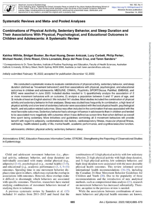 We conducted a systematic review to evaluate combinations of physical activity, sedentary behavior, and sleep duration (defined as “movement behaviors”) and their associations with physical, psychological, and educational outcomes in children and adolescents. MEDLINE, CINAHL, PsychInfo, SPORTDiscus, PubMed, EMBASE, and ERIC were searched in June 2020. Included studies needed to 1) quantitatively analyze the association of 2 or more movement behaviors with an outcome, 2) analyze a population between 5 and 17 years of age, and 3) include at least an English abstract.We included 141 studies. Most studies included the combination of physical activity and sedentary behavior in their analyses.Sleep was studied less frequently. In combination, a high level of physical activity and a low level of sedentary behavior were associated with the best physical health, psychological health, and education-related outcomes.Sleep was often included in the combination that was associated with the most favorable outcomes.Sedentary behavior had a stronger inf luence in adolescents than in children and tended to be associated more negatively with outcomes when it was defined as screen time than when defined as overall time spent being sedentary. More initiatives and guidelines combining all 3 movement behaviors will provide benefit with regard to adiposity, cardiometabolic risk factors, cardiorespiratory fitness, muscular physical fitness, well-being, health-related quality of life, mental health, academic performance, and cognitive/executive function.