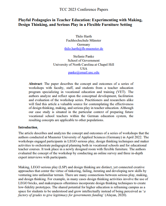 The paper describes the concept and outcomes of a series of workshops with faculty, staff, and students from a teacher education program specializing in vocational education and training (VET). The authors analyze and reflect upon the conceptual development, facilitation and evaluation of the workshop series. Practitioners and researchers alike will find this article a valuable source for contemplating the effectiveness of design thinking, making, and serious play in teacher education. Although our case study is situated in the particular context of preparing future vocational school teachers within the German education system, the resulting concepts are applicable to other populations.
