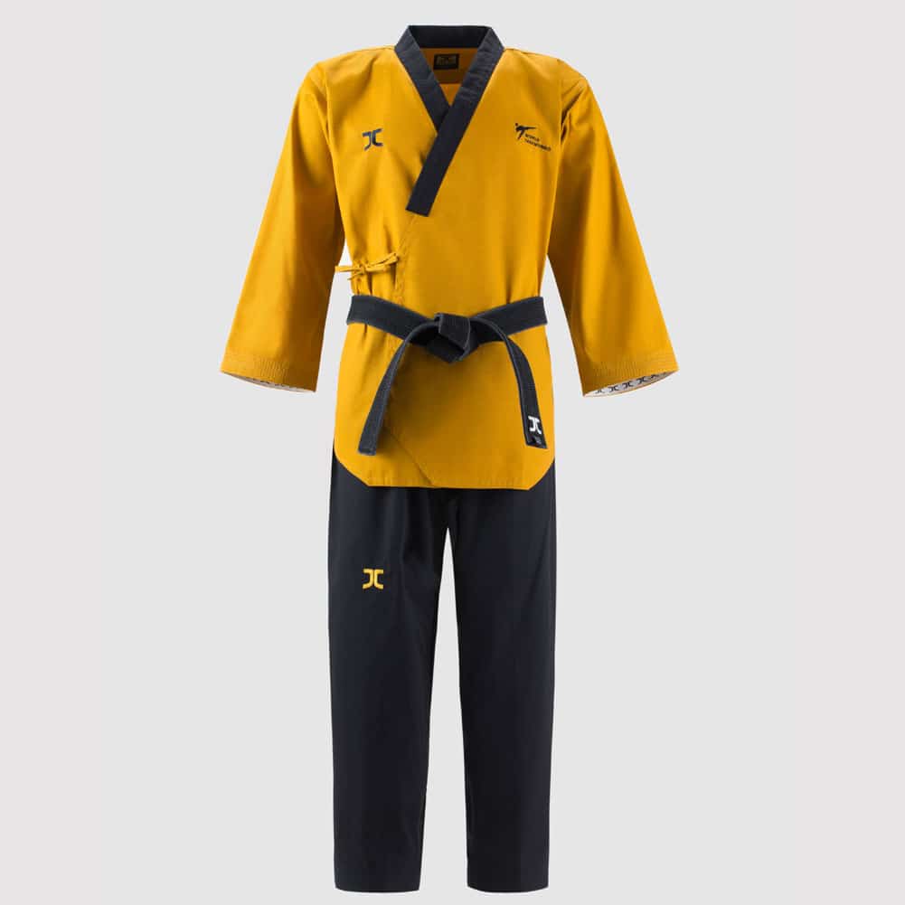 The Master Pro-Athlete Poomsae uniform is for the MASTER Division. The gold-colored jacket is a mix of 65% polyester and 35% cotton. The black trousers are 100% polyester. The uniform is light, breathable and durable. Belt not included.