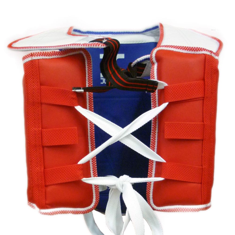 Lightweight and strong. WTF approved and CE Certified. Adjustable rear strap for improved fit with padded shoulder area. Reversible red and blue colour. Ideal for training and competition.