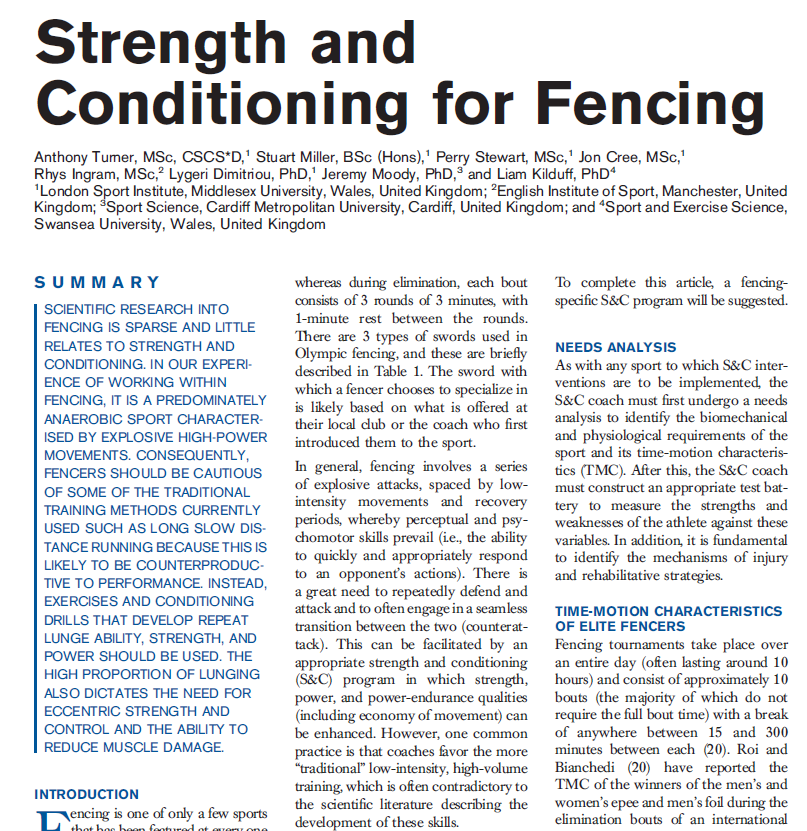 SCIENTIFIC RESEARCH INTO FENCING IS SPARSE AND LITTLE RELATES TO STRENGTH AND CONDITIONING. IN OUR EXPERIENCE OF WORKING WITHIN FENCING, IT IS A PREDOMINATELY ANAEROBIC SPORT CHARACTERISED BY EXPLOSIVE HIGH-POWER MOVEMENTS. CONSEQUENTLY, FENCERS SHOULD BE CAUTIOUS OF SOME OF THE TRADITIONAL TRAINING METHODS CURRENTLY USED SUCH AS LONG SLOW DISTANCE RUNNING BECAUSE THIS IS LIKELY TO BE COUNTERPRODUCTIVE TO PERFORMANCE. INSTEAD, EXERCISES AND CONDITIONING DRILLS THAT DEVELOP REPEAT LUNGE ABILITY, STRENGTH, AND POWER SHOULD BE USED. THE HIGH PROPORTION OF LUNGING
