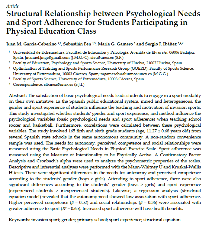 significant differences according to the students’ gender (boys > girls) and sport experience (experienced students > inexperienced students). Likewise, a regression analysis (structural equation model) revealed that the autonomy need showed low association with sport adherence. Higher perceived competence (β = 0.52) and social relationships (β = 0.36) were associated with greater adherence to sport (R2 = 0.65). Increased sport adherence will have health benefits.
