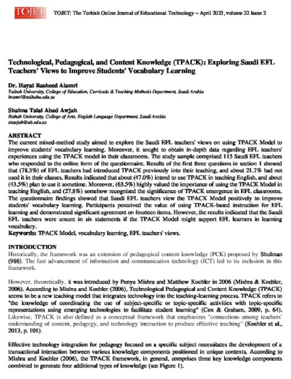 The current mixed-method study aimed to explore the Saudi EFL teachers’ views on using TPACK Model to improve students’ vocabulary learning. Moreover, it sought to obtain in-depth data regarding EFL teachers’ experiences using the TPACK model in their classrooms. The study sample comprised 115 Saudi EFL teachers who responded to the online form of the questionnaire. Results of the first three questions in section 1 showed that (78.3%) of EFL teachers had introduced TPACK previously into their teaching, and about 21.7% had not used it in their classes. Results indicated that about (47.0%) intend to use TPACK in teaching English, and about (43.5%) plan to use it sometime. Moreover, (63.5%) highly valued the importance of using the TPACK Model in teaching English, and (27.8%) somehow recognized the significance of TPACK emergence in EFL classrooms. The questionnaire findings showed that Saudi EFL teachers view the TPACK Model positively to improve students’ vocabulary learning. Participants perceived the value of using TPACK-based instruction for EFL learning and demonstrated significant agreement on fourteen items. However, the results indicated that the Saudi EFL teachers were unsure in six statements if the TPACK Model might support EFL learners in learning vocabulary.